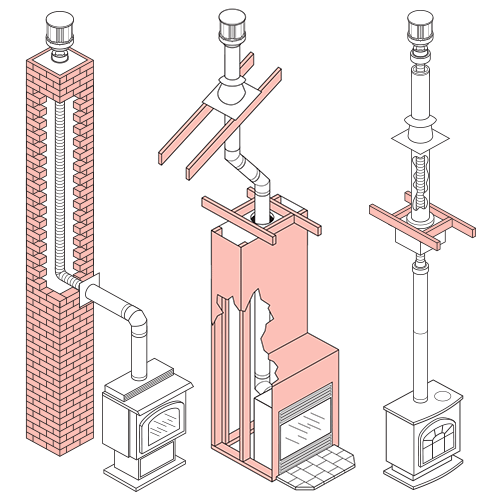 Technical drawings created for a manufacturer of venting and chimney accessories. These are part of a large series of drawings demonstrating typical fireplace installations as they relate to BDM venting products.