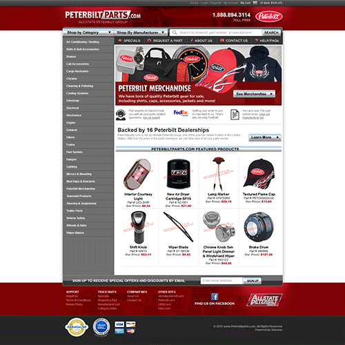 PeterbiltParts.com came about as a desire to provide owner operators and small fleets with the best selection of Peterbilt truck parts on the internet. As the Creative Services Manager at Allstate Peterbilt Group, I had exclusive responsibility over the planning, art direction, content development, and testing of this website. Additional tasks included day-to-day SEO/SEM activities, analysis of SEO/site performance using analytics, and assessment of end-user needs through our call-center, then plotting and and implementing improvements to the user interface.